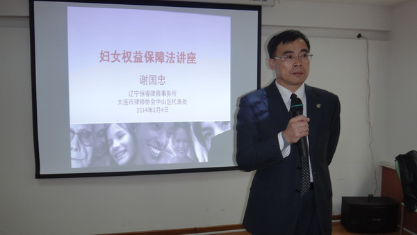 2014年3月4日,为响应 “2014年‘三八’妇女维权周暨女性文化素质工程百场社区普法宣传活动”,进一步深化妇女法制宣传教育,中山区代表处委派辽宁恒睿律师事务所律师谢国忠到海军广场社区为居民讲解妇女维权知识,通过此次讲座,在场的60余名女性同胞对妇女维权法律知识有了进一步了解,更加懂得用法律的武器保护自己,代表处也以自己的行动为营造良好的宣传妇女、重视妇女、关心妇女的社会氛围带个好头。