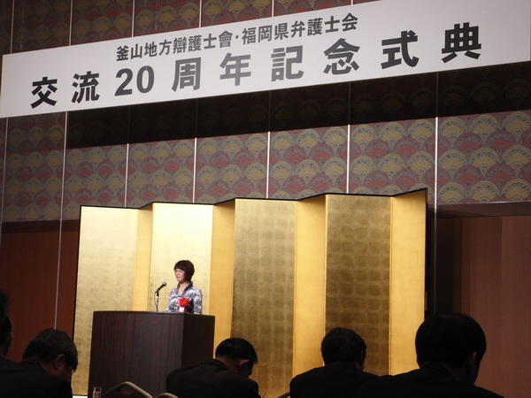 刘挪律师代表我会及张耀东会长在纪念大会上发表致辞。她首先向日本国福冈县辩护士会与韩国釜山律师会建立的持久友谊和为两国律师事业发展做出的积极努力表示衷心的祝贺。她说,过去的2009年,是中国律师制度恢复三十周年。三十年的风雨历程,中国律师在社会民主法制建设中发挥了积极作用。此次参加福冈县辩护士会与釜山律师会签订交流协会20周年庆祝大会是具有长远意义的。三方律师事业的发展交流不仅是三方律师界发展的大事,更关乎三方的持久友谊,借此良机。刘挪律师也表达了我会与韩国釜山律师会建立友好交流的愿望。釜山律师会愼鏞道会长当即表示回国后同其他会长及相关人员商讨与我会建立交流联系事宜。
