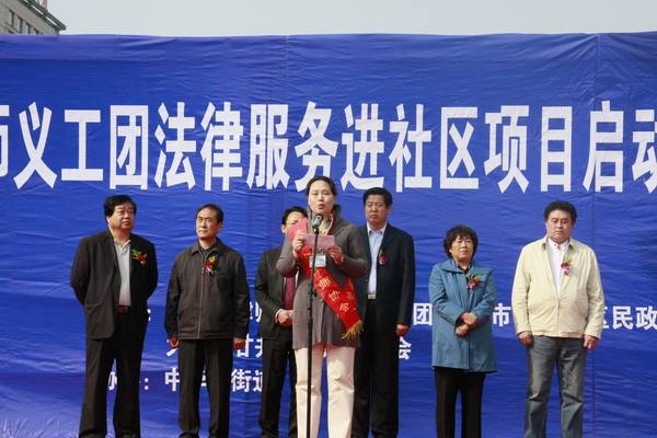 义工团秘书长金丽君代表全体律师义工向全市律师发出倡议:积极参与法律服务进社区的公益活动中,秉承“奉献、友爱、互助、进步”的志愿精神,进驻社区,服务民众,将法制与和谐播撒到每一个服务对象的心里。