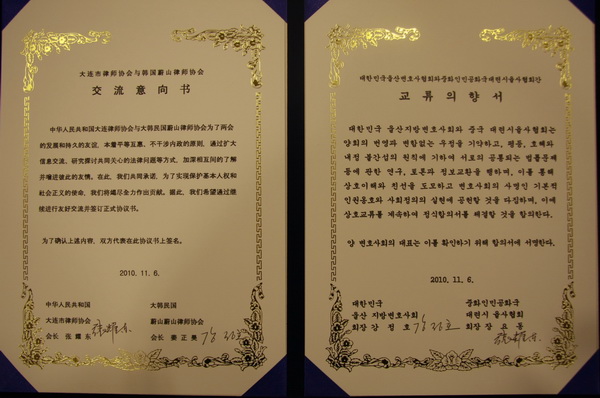 11月4日至7日,张耀东会长及韩语律师方春福、日语律师刘同强应韩国釜山及蔚山律师会邀请到韩国参加釜山律师会与日本福冈县辩护士会签订交流协议20周年纪念会并与蔚山律师会签订交流协议(附后),开启大连律师与韩国律师交流的大门。