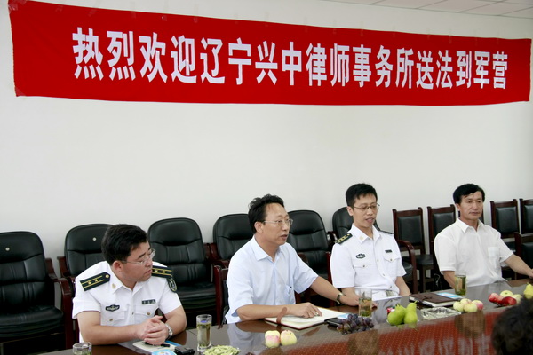 为庆祝建军81周年,辽宁兴中律师事务代表大连市律师和大连市法制宣传协会在旅顺海军某部举行了送法进军营活动。