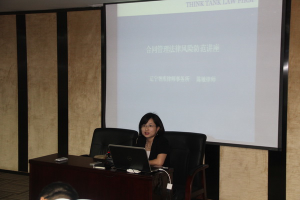 2014年8月21日,受大连市沙河口区助万企服务中心的邀请,辽宁智库律师事务所陈敏律师为来自房地产开发、建设施工、贸易投资、财务管理、高新科技等行业的五十多家企业的管理人员进行了《合同管理法律风险防范》的专题公益讲座。本次讲座就企业关心的合同管理存在的误区,合同订立、履行常见问题,合同审查应当注意的十五个要害问题,合同常规四大合同类型以及智库律师事务所在合同审查及管理方面的实务经验等,逐一给予讲解。整个讲座案例生动详实,内容贴近企业需求,极具实操性,对企业在建立健全合同管理制度等方面有非常实际的指导作用。